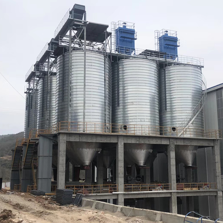 接收与清理设置在筒仓中央该形式筒仓一般采用对称排列,提升机井架固定,经过提升后的物料通过仓顶溜管进人筒仓。这种形式省去了仓顶输送设备和上通廊,从而节省了建造费用,缩短了建造工期。对于贮存时间要求较长的大型粮库,则应根据物料的流向、场地情况、工艺要求等合理地配置投料口、工作塔、烘干塔及保亭钢板仓的位置。国华钢板仓介绍了这几种常见的进料形式,实际中可将各种形式相互组合,相互渗透,根据实际情况合理搭配,灵活选用。
